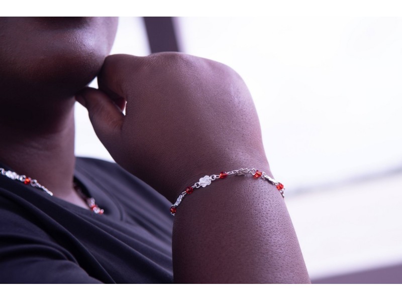 Bij ons koop je de mooiste Surinaamse sieraden, zoals deze mattenklopper armband met rode ogri ai kralen erin verwerkt.